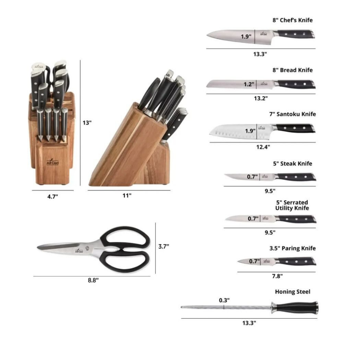 All-Clad Forged Knives bring a perfect balance of craftsmanship and performance. The fully forged design features German stainless-steel blades* optimized by a cryogenic treatmentfor better performance, durability, and corrosion resistance. The 26-degree total cutting edge ensures expert cutting precision without chipping – not only promising to start sharp but to stay sharp (excludes bread, utility and steak knives, which have an 18-degree cutting edge).