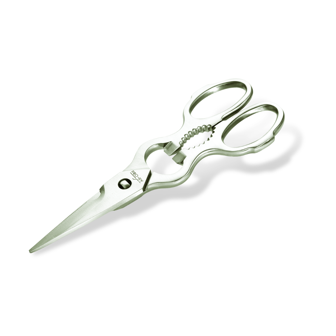 The All-Clad 8 Inch Stainless Steel Kitchen Shears can handle a variety of kitchen tasks. The finely honed edges and micro-serrated upper blade are geared towards cutting herbs with precision to trimming poultry. Crafted from heavy gauge stainless steel, this tool offers exceptional durability that withstands daily use and preserves its appearance. Designed with ergonomically riveted large handles for a secure, comfortable grip. Handles include holes for hanging or displaying in your kitchen.