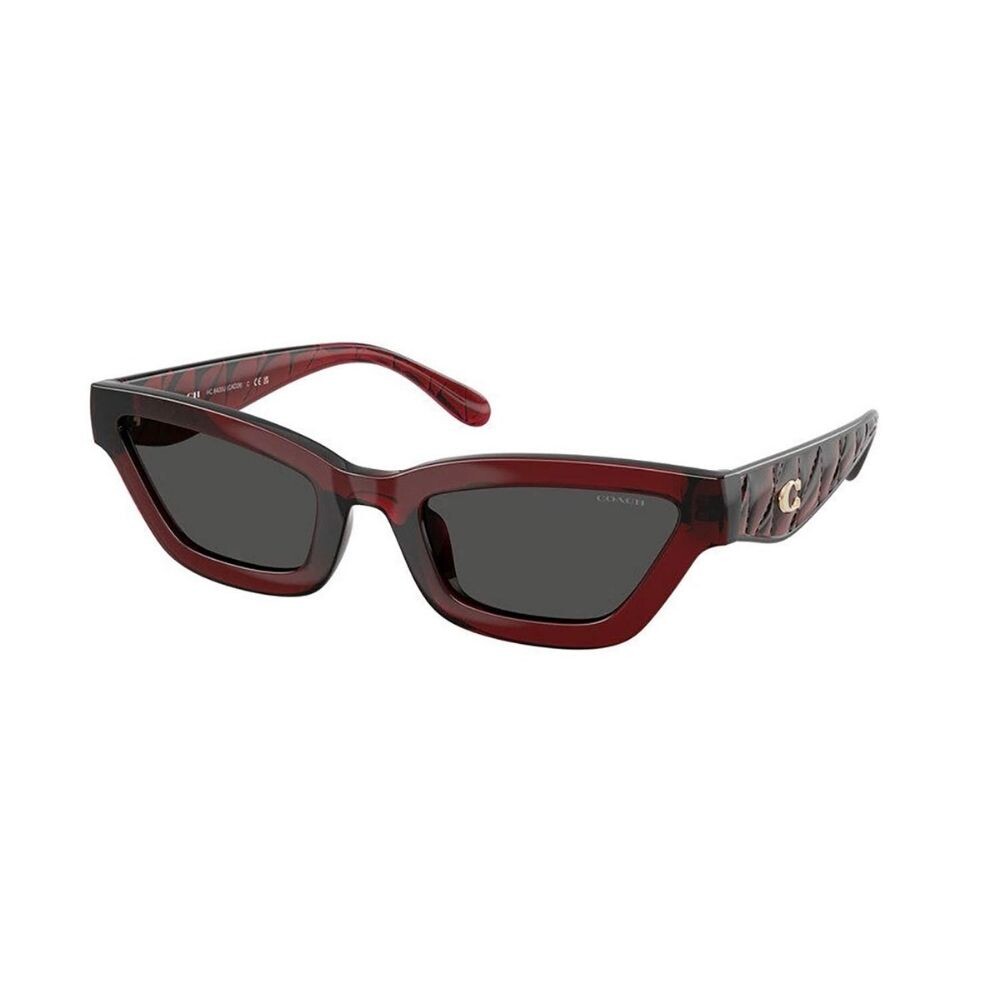 Coach presents the HC8420U sunglasses, a sleek rectangular silhouette inspired by the brand’s iconic Pillow Tabby design. Taking cues from a Coach runway style, this contemporary frame offers a modern twist on timeless luxury. Crafted from lightweight bio-injected material for all-day comfort, the design features a deep transparent red hue and drooped temples with quilted detailing, a nod to the beloved Pillow Tabby bag. Finished with sophisticated grey lenses, the HC8420U sunglasses deliver high UV protection while elevating your look with effortless elegance.