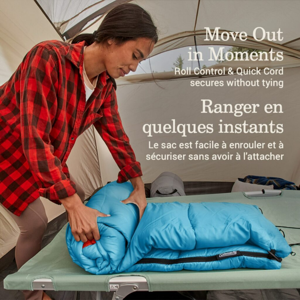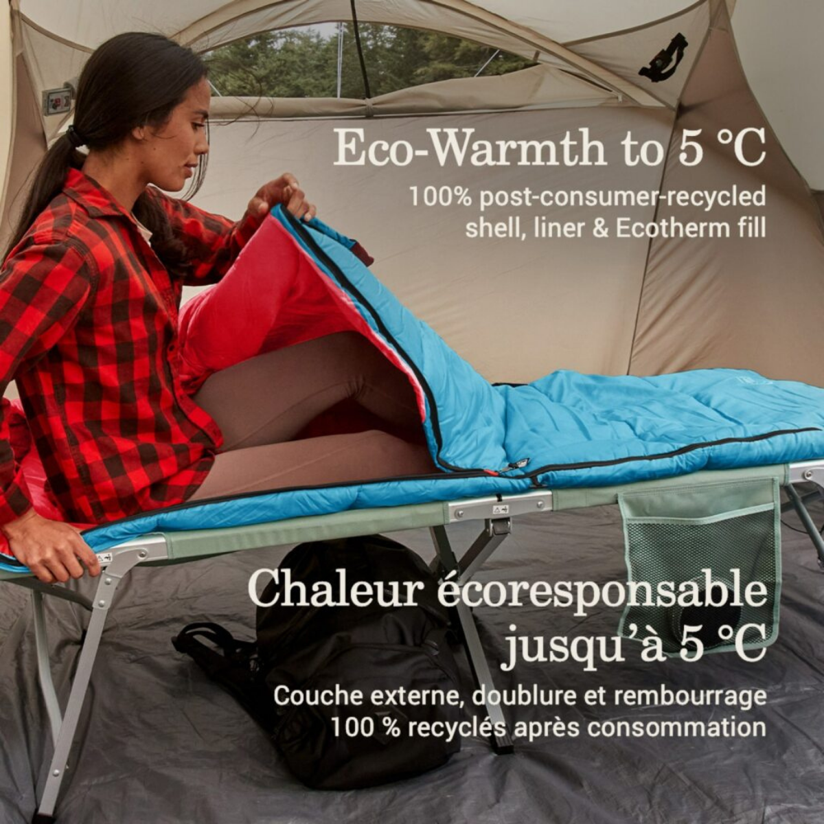 You cherish the outdoor environment and at Coleman® we do, too. That’s why our Flatlands™ cold-weather sleeping bags are made with 100% post-consumer-recycled polyester in the shell, liner, and Ecotherm™ fill. Plus, it’s designed to keep you warm in temperatures as low as 40°F and it’s loaded with convenient features. The premium zipper has snag-free ZipPlow construction and a Thermolock™ draft tube to keep cold air out. A handy interior pocket keeps cell phone batteries warm and small items like keys easy to find, even in the dark. And when it’s time to pack up, the Roll Control™ feature keeps the bag straight, while the Quick Cord™ feature secures without tying. 33″ x 75″ size. Machine washable. 5-year limited warranty.
