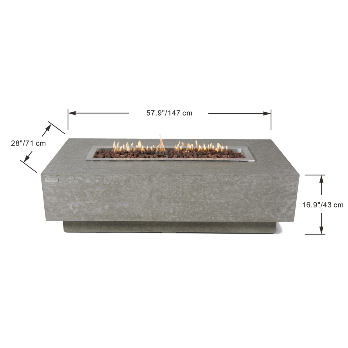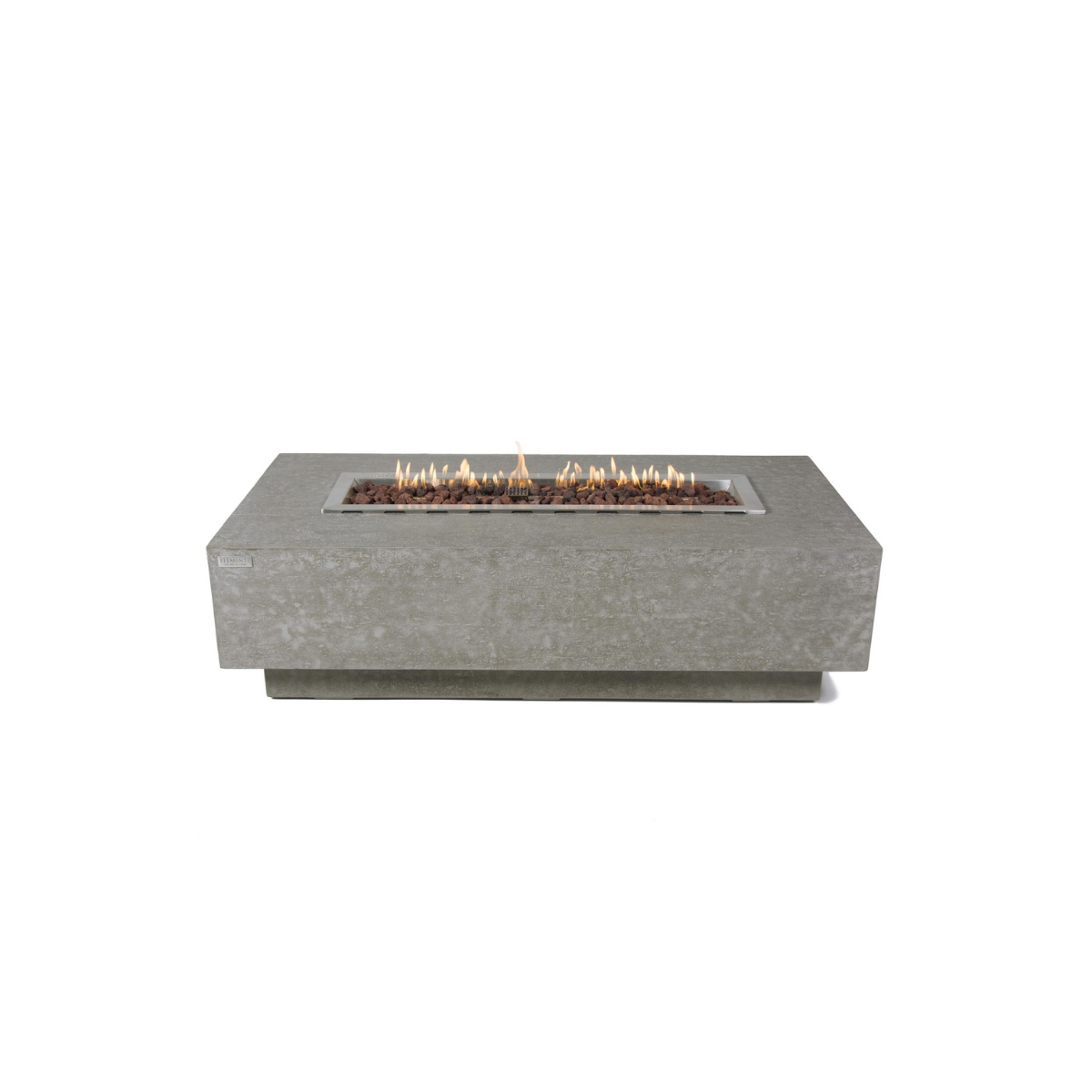 The Elementi Kingsale fire table features a glass-fiber reinforced concrete textured finish in light gray. The table is easy to set up with a pre-attached 10-ft hose (3/8″) with a ½” brass quick connect end to connect to a natural gas source.