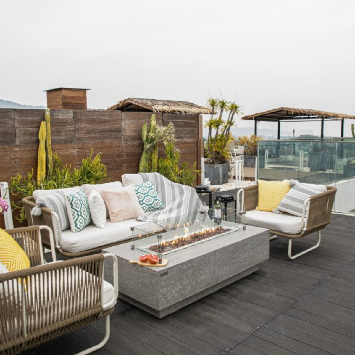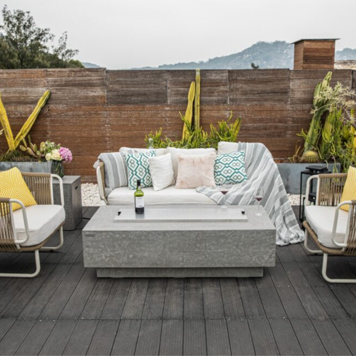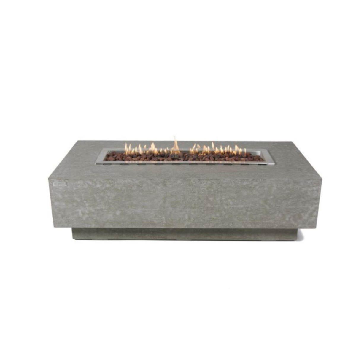 The Elementi Kingsale fire table features a glass-fiber reinforced concrete textured finish in light gray. The table is easy to set up with a pre-attached 10-ft hose with a regulator for connection to a propane tank.