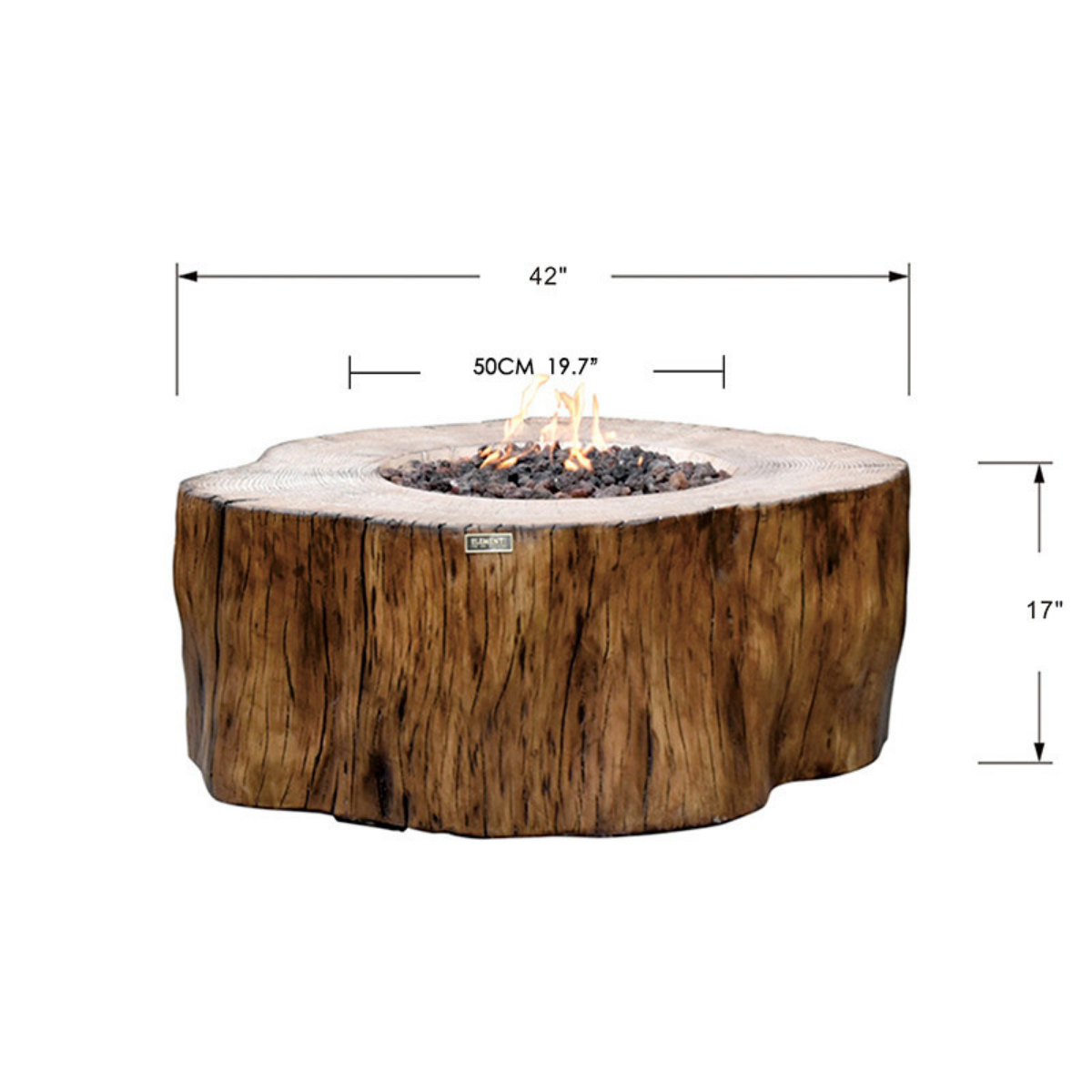 The Elementi Manchester fire table features a glass-fiber reinforced concrete textured finish in Redwood. The table is easy to set up with a pre-attached 10-ft hose with a regulator for connection to a propane tank.