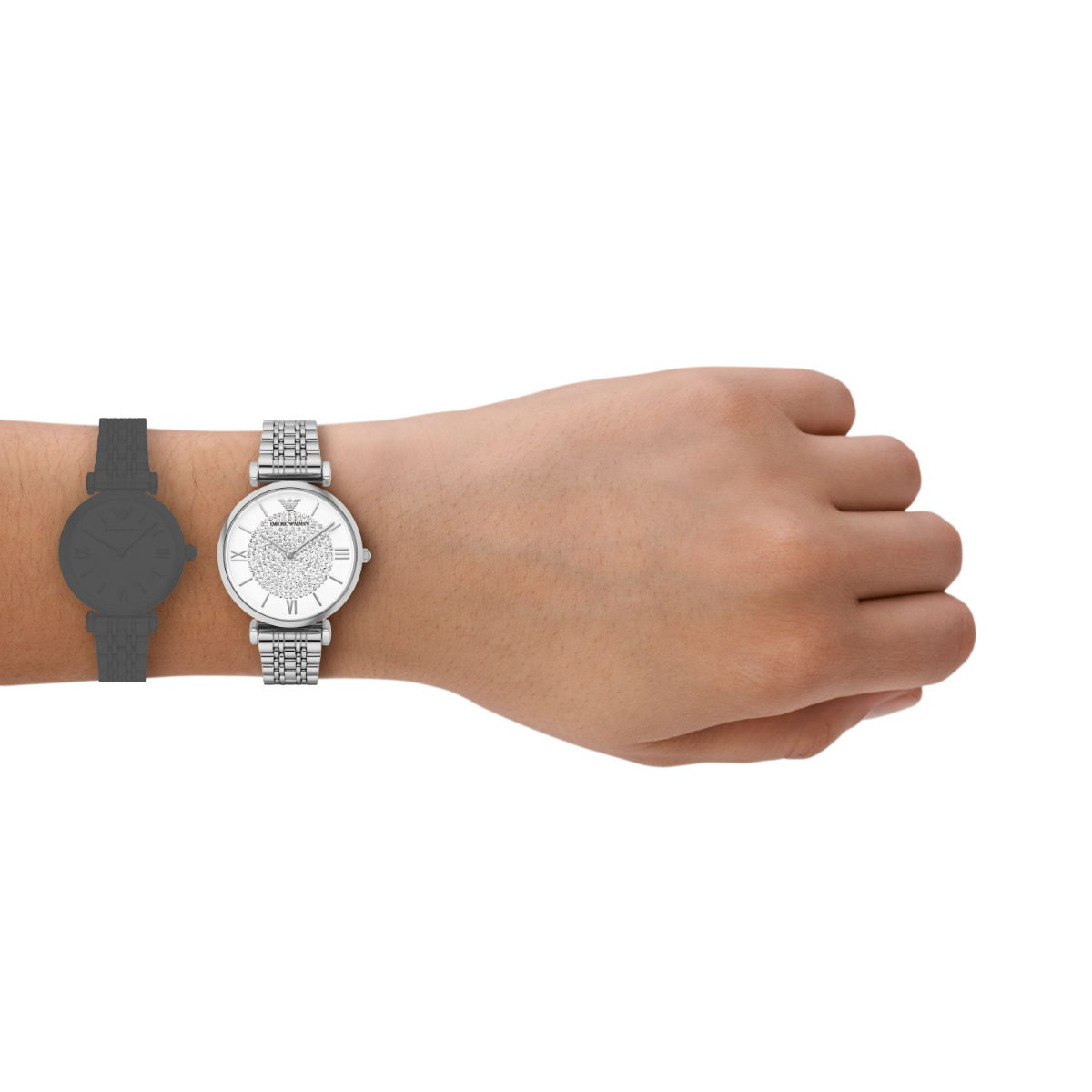 A sparkling crystal dial makes this Emporio Armani T-Bar watch a sophisticated showstopper, anchored by a polished silver-tone bracelet.