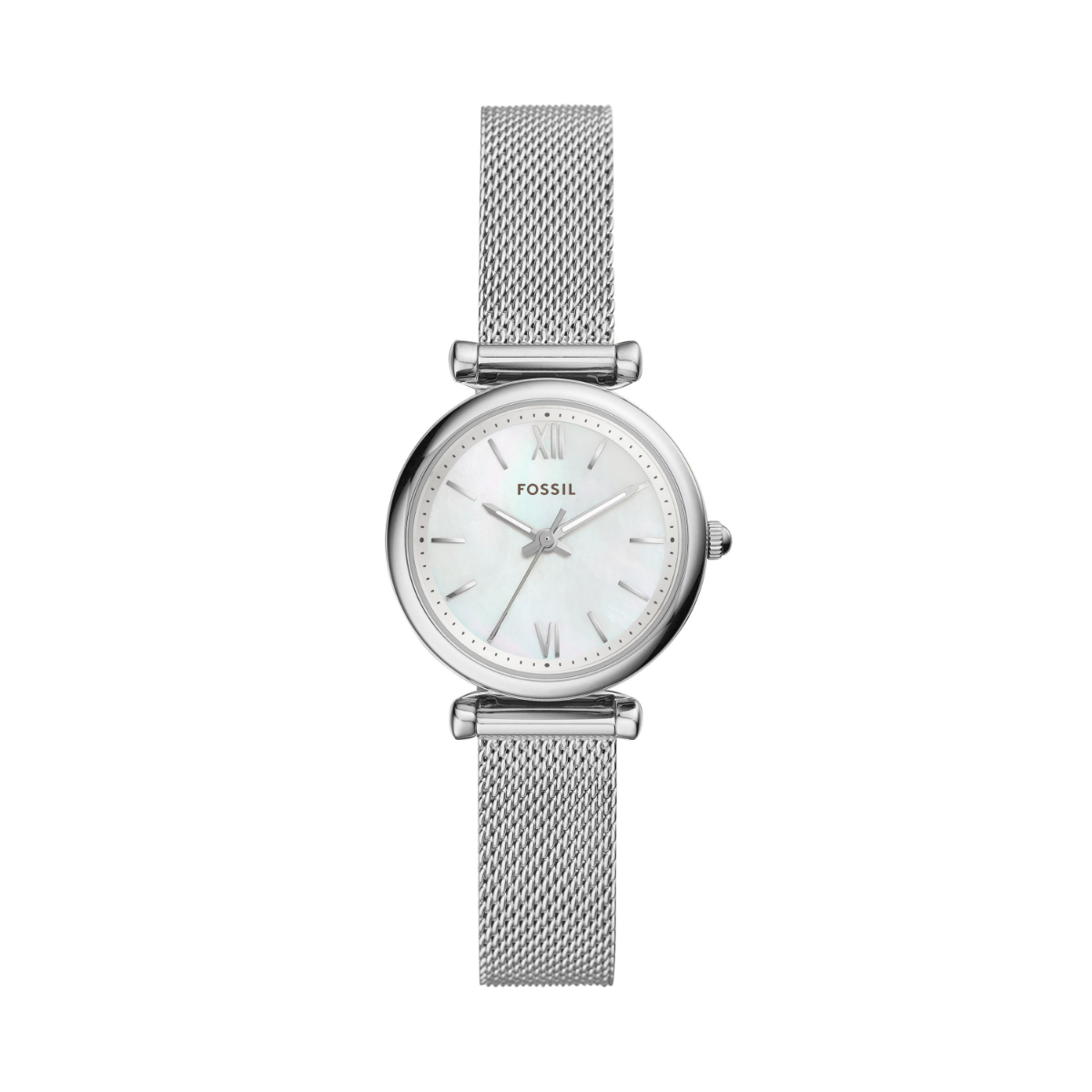 This 28mm Carlie Mini features a mother-of-pearl dial with Roman numerals, three-hand movement and stainless steel mesh bracelet.