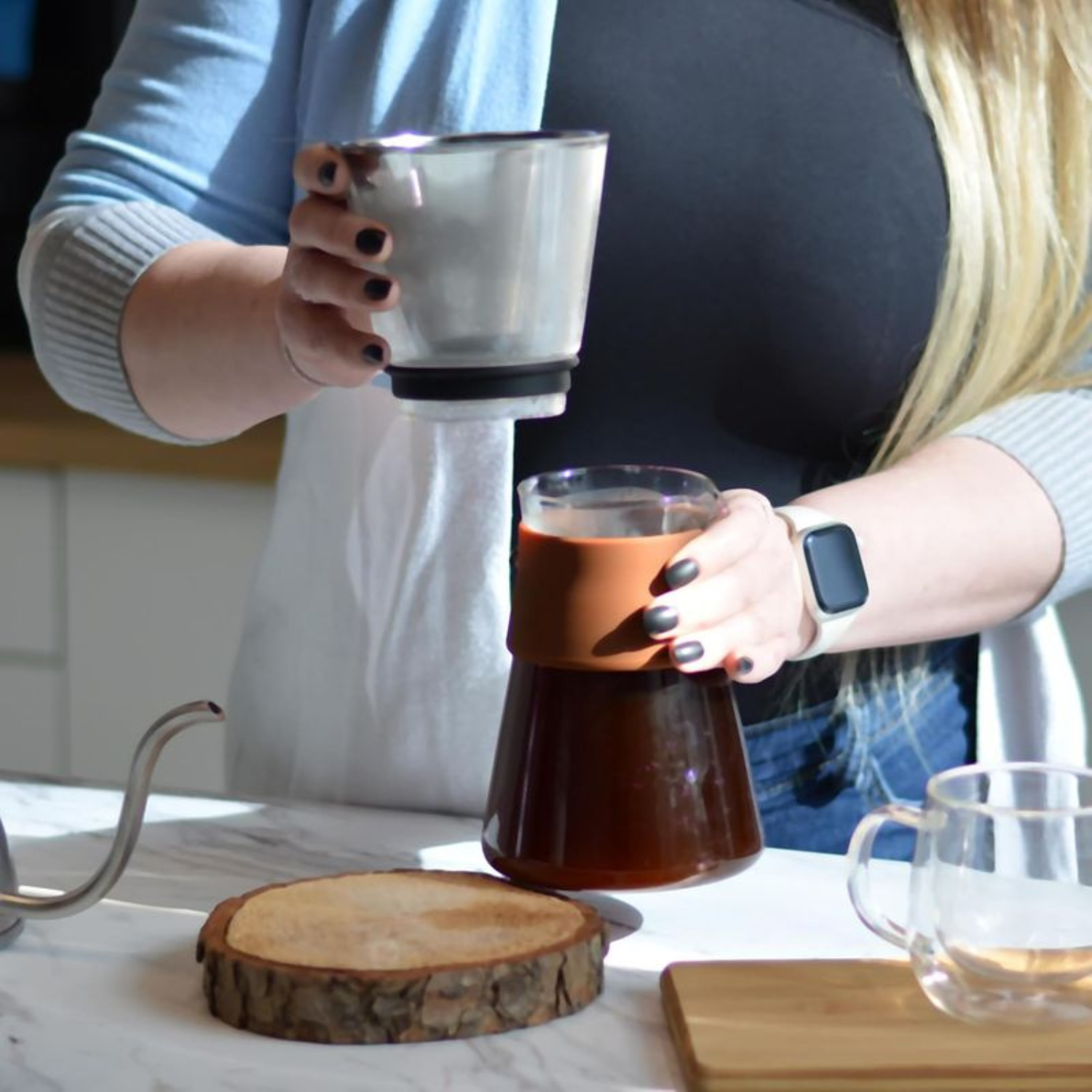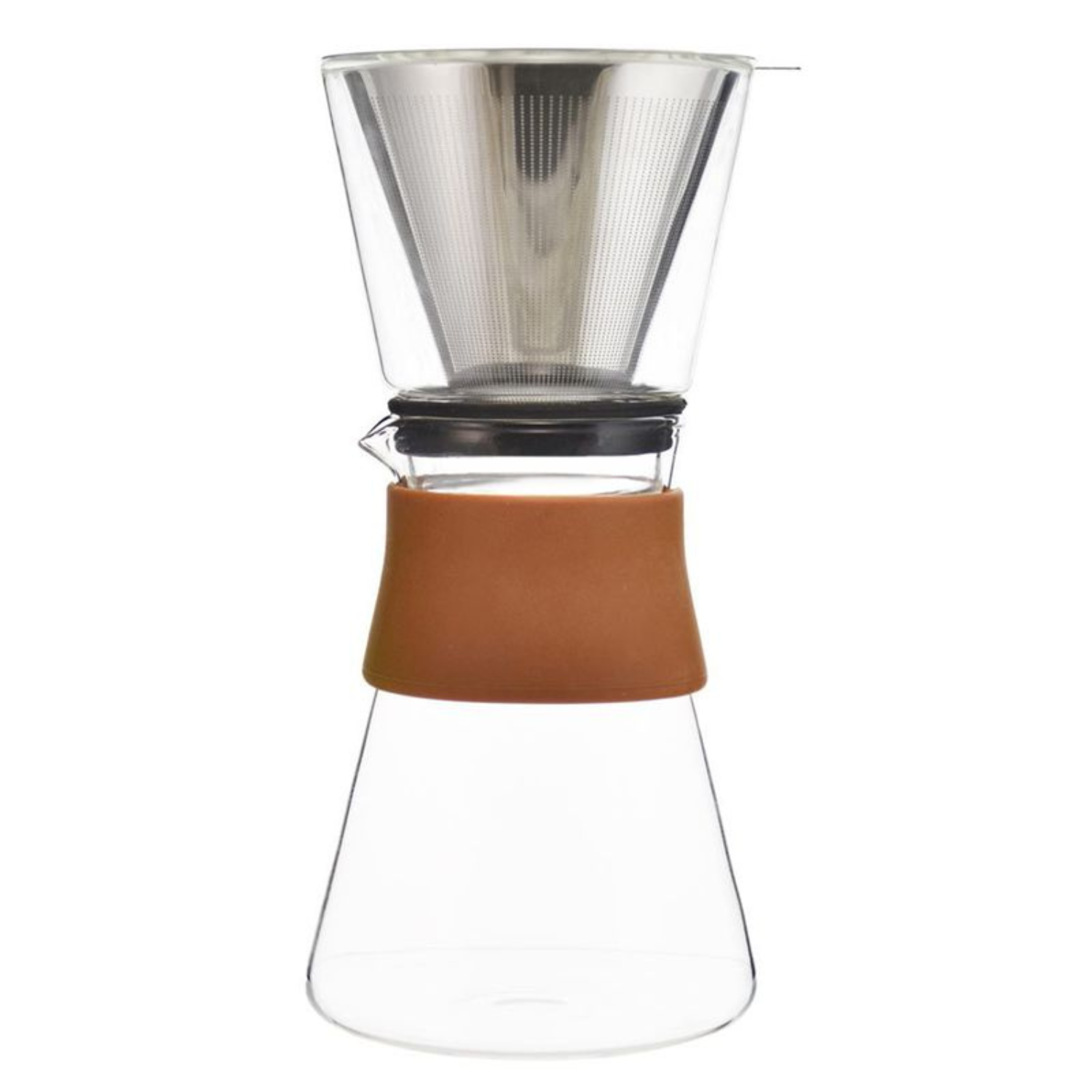 Pour Over Coffee Maker to Brew the Best Cup of Coffee at Home The Amsterdam is our newest and best pour over coffee maker for personal home use. With a removable glass top, a double layer fine hole mesh filter, and a modern carafe, its design is unique and easy to use for brewing the perfect cup of coffee. The Amsterdam has a double layer coffee filter that is made from 18/8 stainless steel. It filters your coffee perfectly, and all without a paper filter! This way you do not lose any of the essential oils and no papery taste will transfer to your coffee. The two layers are both made of stainless steel, without any plastic components. So you know your coffee will taste pure without any plastic to taint or leech into it. Secondly, the mesh is just the right size to allow much of the coffee oils to seep into your cup while filtering all the grinds perfectly.