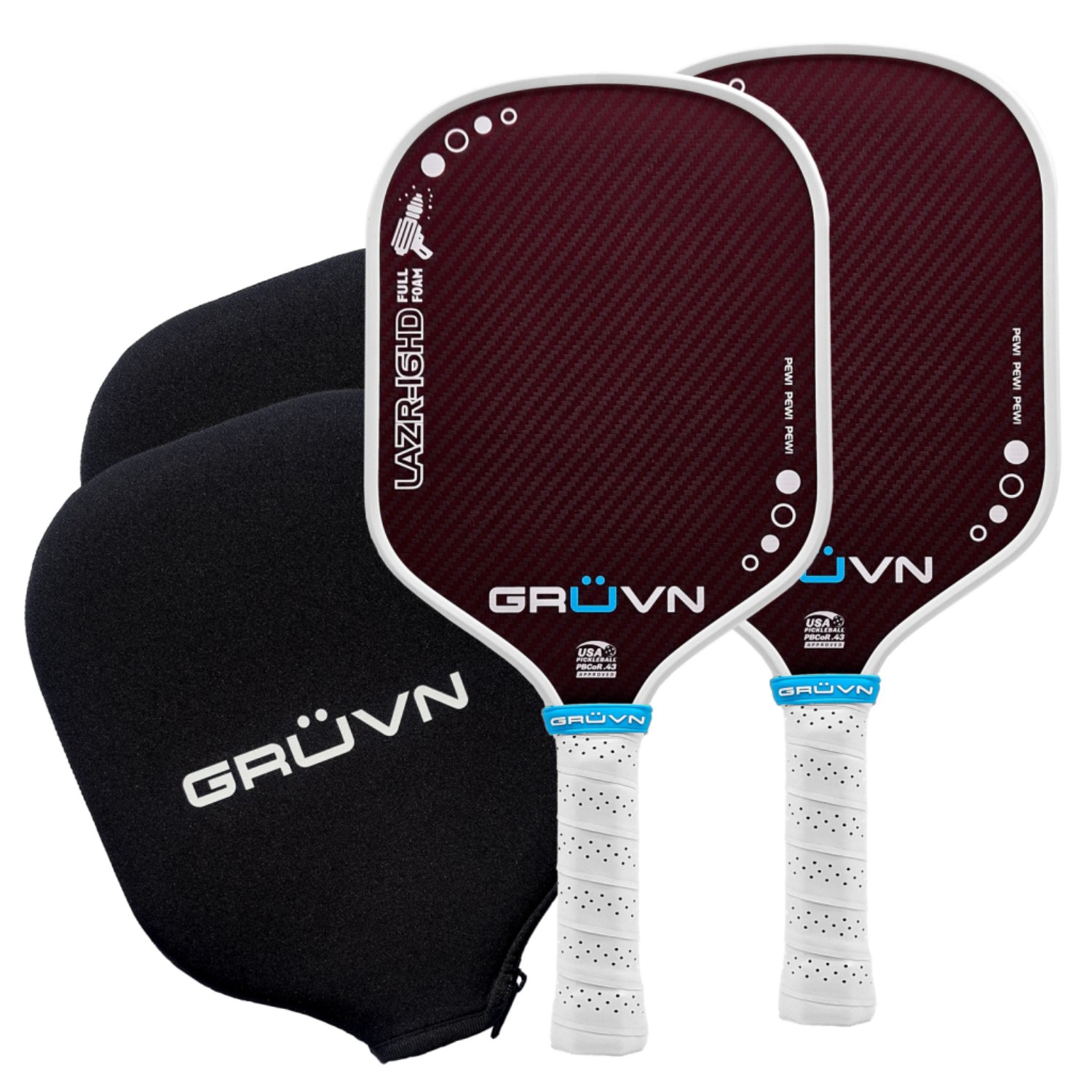 This pickleball paddle set includes 2 LAZR-16HD Full Foam (hybrid shape) pickleball paddles that have a dual-density full foam core. It is a high-performance paddle with a Kevlar-carbon fiber blend surface and a 16mm core. A great balance of stability, feel, controllable power, pop, and spin. It is USAP PBCoR 0.43 Certified for tournament play. DuPont™ and Kevlar® are trademarks or registered trademarks of affiliates of DuPont de Nemours, Inc. This paddle falls in that sweet spot of All-Court leaning power and low-tier power. The dual-density foam core provides a comfortable foamy feel compared to some other hollower feeling paddles, along with great stability. The core combined with the Kevlar-carbon fiber surface provides a solid amount of power and pop and great spin, ideal for players of any level. Our custom hybrid shape is often mentioned as being the perfect shape for players who prefer hybrid paddles. With a length of 16.2” and width of 7.8” and no taper, the shape provides a perfect mix of the control of wide body paddles and the power of elongated paddles. The 5.5” handle length allows for powerful two-handed backhands, and the rounded top of the paddle face gives players an aerodynamic feel.
