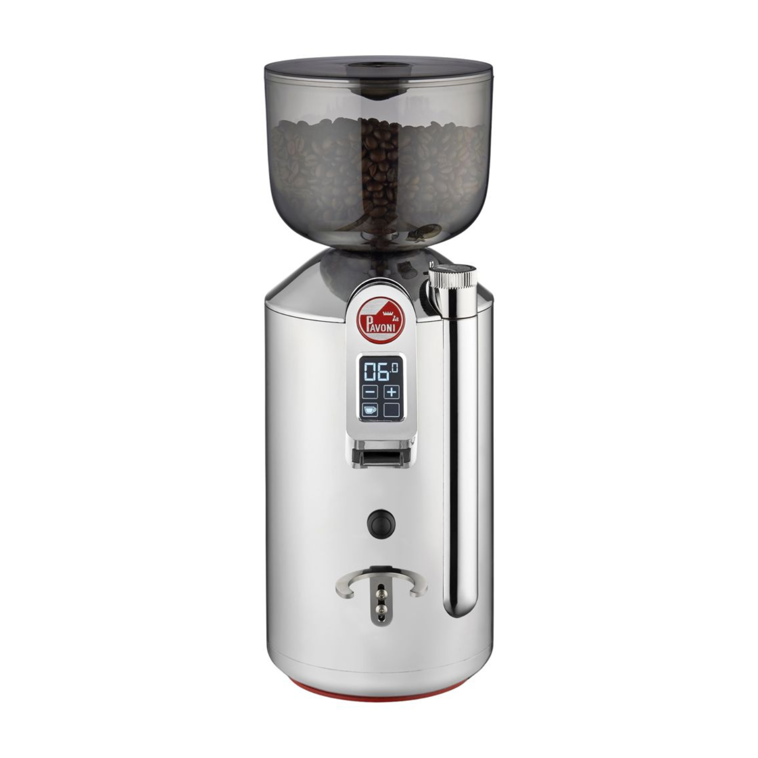 Coffee grinder with a 500 g Tritan hopper and a soft and elegant chromed aluminium body. The integrated LCD display offers a user-friendly interface, enabling you to choose from a variety of grinding programs to suit your specific coffee preferences.