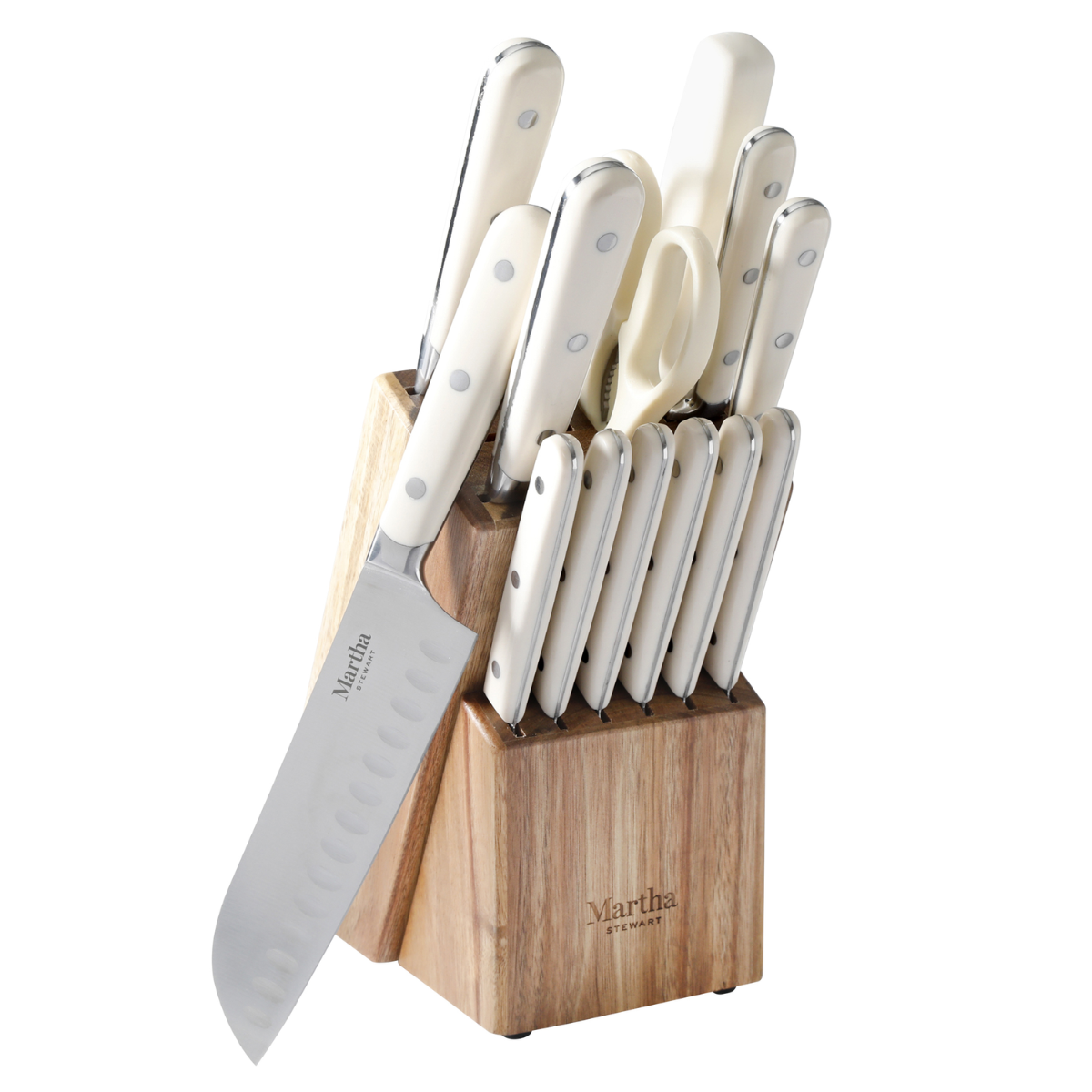 Elevate your kitchen with the Martha Stewart Eastwalk 14-Piece Cutlery Set, designed to combine modern style with everyday performance. Featuring durable stainless steel blades and ABS forged handles in a soft linen finish, this set delivers comfort, balance, and reliable cutting precision. The knives are neatly stored in a natural acacia wood block that adds warmth and elegance to any countertop. Perfect for daily meal prep or entertaining, this versatile cutlery set brings function and refined design together in one complete collection.