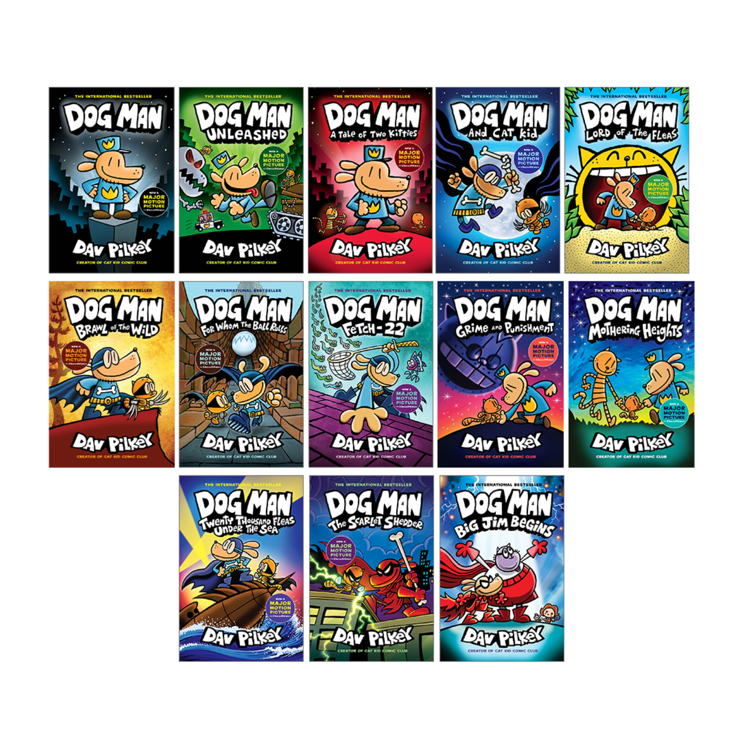 This fantastic collection of 13 Dog Man books includes: Dog Man: A Graphic Novel (Dog Man #1), Dog Man Unleashed: A Graphic Novel (Dog Man #2), Dog Man: A Tale of Two Kitties: A Graphic Novel (Dog Man #3), Dog Man and Cat Kid: A Graphic Novel (Dog Man #4), Dog Man: Lord of the Fleas: A Graphic Novel (Dog Man #5), Dog Man: Brawl of the Wild: A Graphic Novel (Dog Man #6), Dog Man: For Whom the Ball Rolls: A Graphic Novel (Dog Man #7), Dog Man: Fetch-22: A Graphic Novel (Dog Man #8), Dog Man: Grime and Punishment: A Graphic Novel (Dog Man #9), Dog Man: Mothering Heights: A Graphic Novel (Dog Man #10), Dog Man: Twenty Thousand Fleas Under the Sea: A Graphic Novel (Dog Man #11), Dog Man: The Scarlet Shedder: A Graphic Novel (Dog Man #12), and Dog Man: Big Jim Begins: A Graphic Novel (Dog Man #13).
