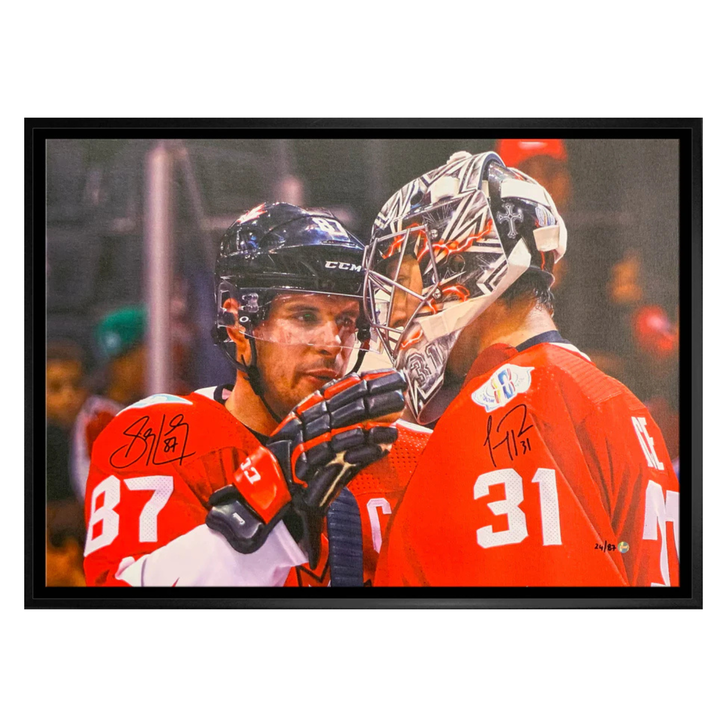 This image of Sidney Crosby and Carey Price is printed on high quality art canvas before being personally autographed by Sidney Crosby and Carey Price, and then being professionally stretched and framed. This canvas comes with a certificate of authenticity and hologram from Frameworth to ensure authenticity. Signatures may vary. Made in Canada