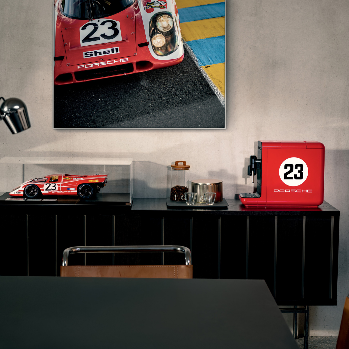 The Porsche x SMEG Bean To Cup Coffee Machine 917 Salzburg – Limited Edition is the most exclusive small domestic appliance in the Porsche x SMEG collaboration, with only 1.970 numbered units available worldwide. Each piece is distinguished by a metal plate that certifies its uniqueness. Inspired by the legendary Porsche 917 KH Salzburg, the machine features the iconic number 23, the Porsche logo, and refined matte black details. Compact yet powerful, it prepares exceptional coffee from freshly ground beans, blending Porsche’s racing heritage with Smeg’s signature elegance for a truly unique experience.