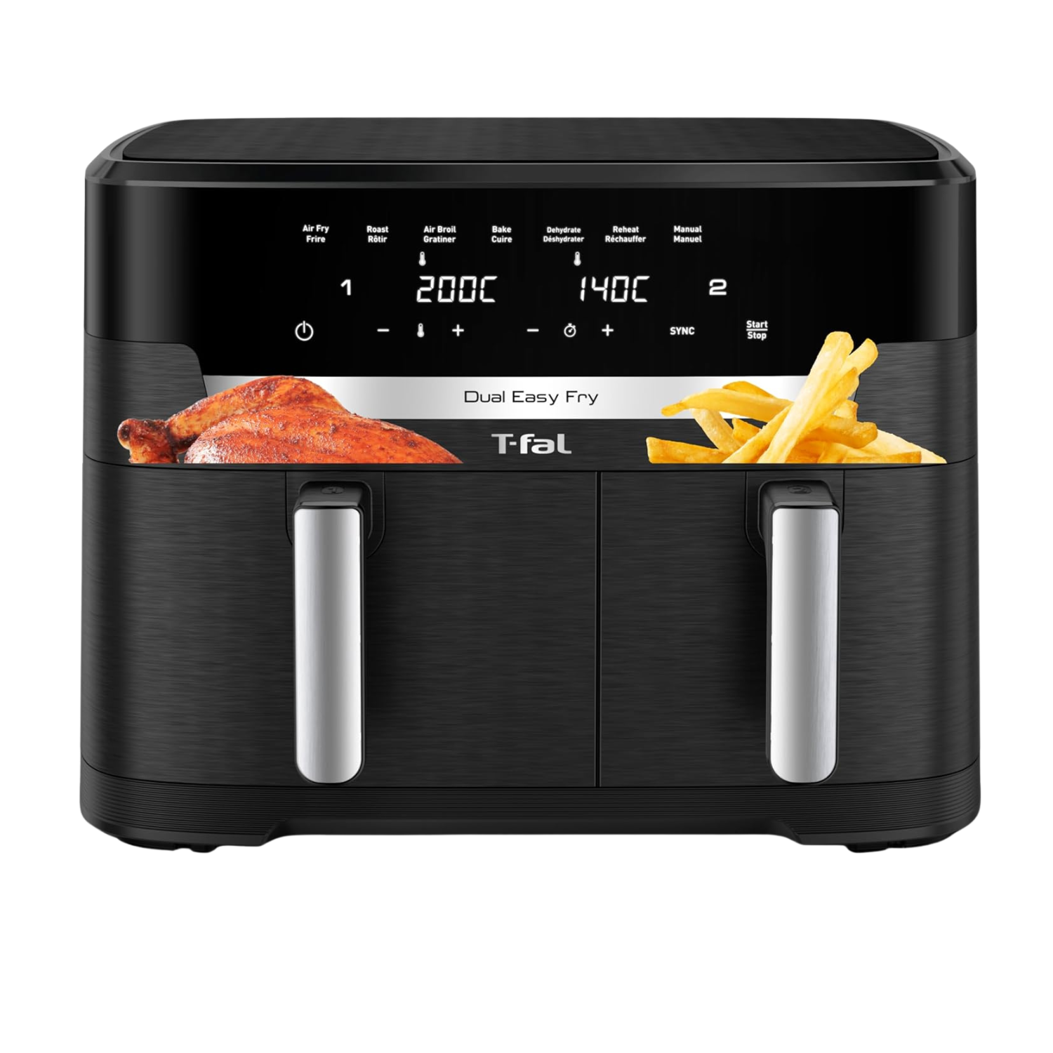 Discover the T-Fal Dual Easy Fry XXL, the ultimate dual basket air fryer with an impressive 11L total capacity divided into 2 baskets for versatile cooking. Perfect for families, it features a 6.5L drawer for large meals like a 2 kg roast and a 4.5L drawer for sides like crispy fries, serving 8-10 people. With 7 pre-set cooking modes, you can air fry, roast, bake, broil, dehydrate, toast, or customize with manual settings. Advanced 360° air circulation and Extra Crisp Technology deliver perfectly golden results with little to no added oil. Cook two dishes at once using synchronized settings, and enjoy effortless cleanup with dishwasher-safe drawers and grids. Get inspired with delicious recipes available on the T-Fal app, and make every meal easier and healthier.