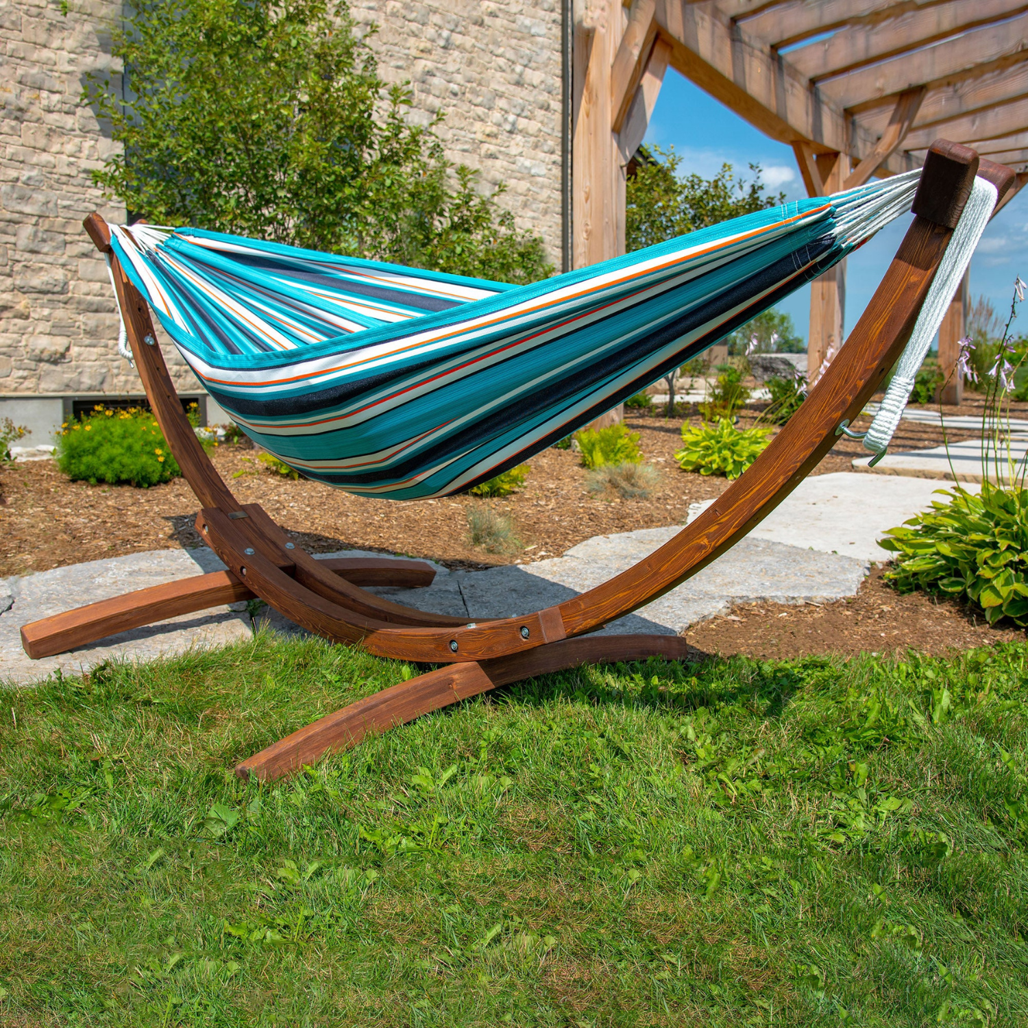 The eye catching solid wood frame sets this Double Sunbrella Hammock with Solid Pine Stand apart from the crowd. It is a natural choice for a rugged design aesthetic or will compliment an immaculate manicured space. The stand provides durability and the double Sunbrella hammock comes in the spectacular Vivere colours that you’ve grown to love.