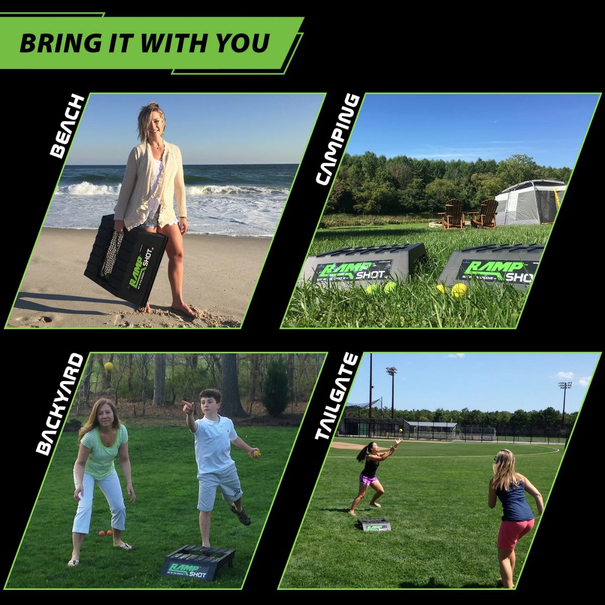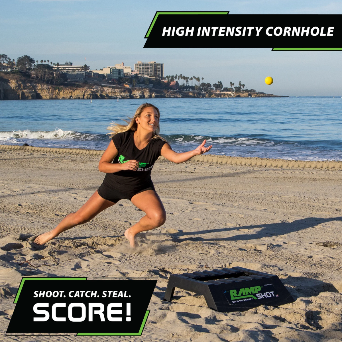 RampShot – Get in the Groove! This toss game is great for tournaments or team play. With all parts included for a 4-player game; set up and game play is a breeze. To play this incredibly competitive game, space the ramps out 15 ft/4.5m or 5 paces apart and determine a starting team. Played in teams of 2 vs. 2, players take turns shooting, catching and stealing balls each round, working with their team to be the first to score exactly 15 points.