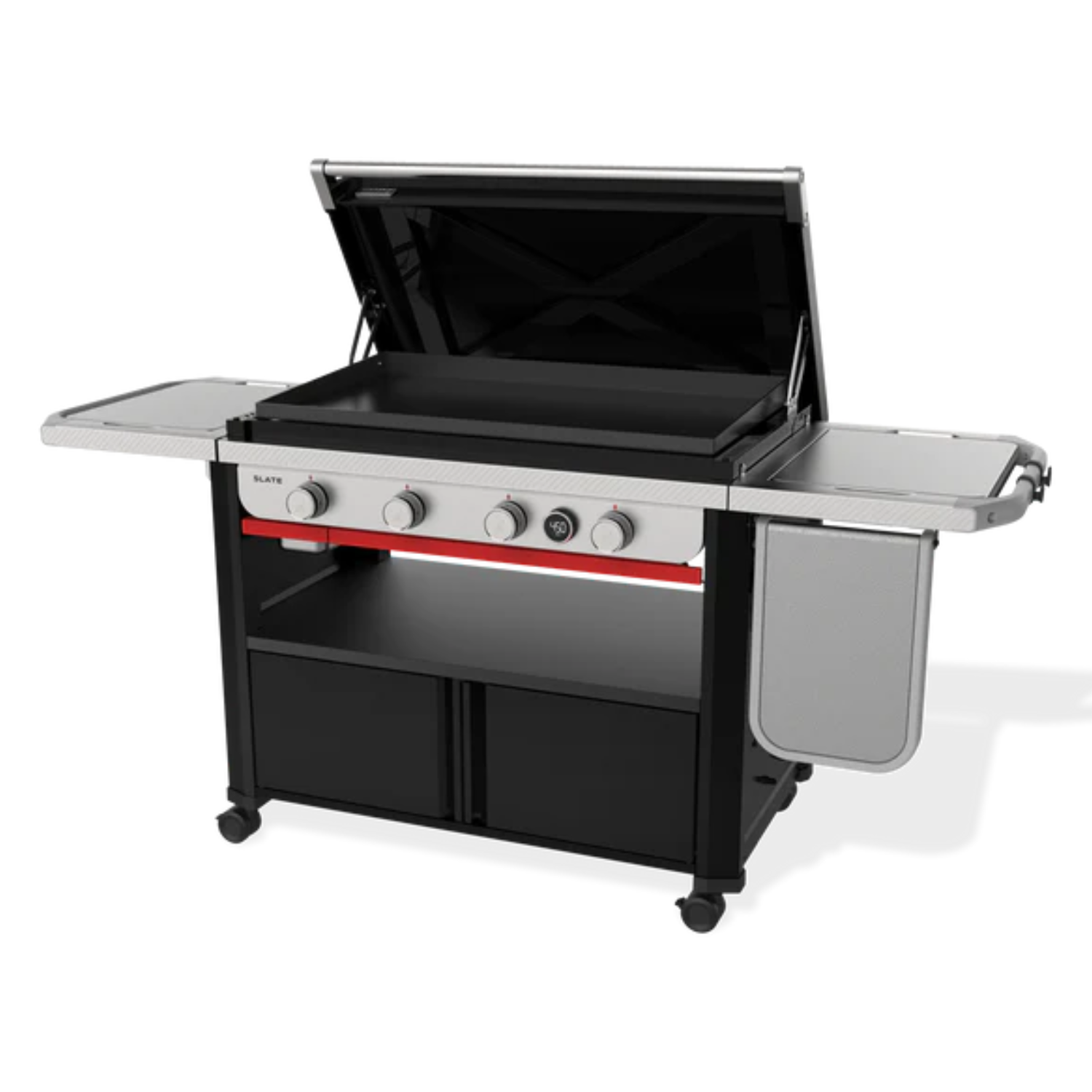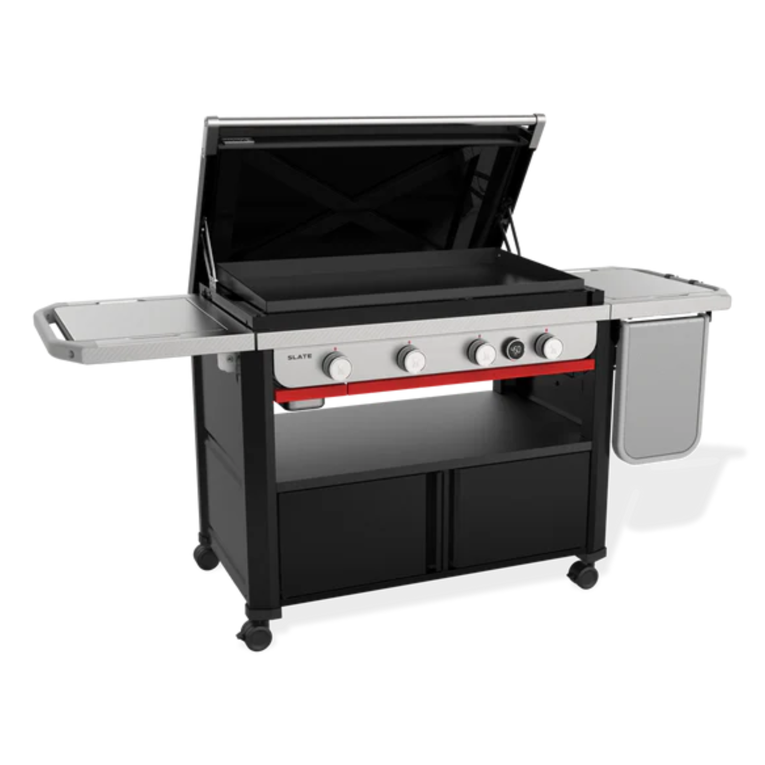 Step up to a premium flat-top grilling experience with the sleek and stylish 28” Slate™ Rust-Resistant Griddle. Start sizzling fajitas, smashing burgers, and stir-frying right out of the box on the pre-seasoned carbon-steel cooktop that stays ready, not rusty, use after use. This griddle quickly reaches over 500ºF and provides even heat across the surface. Wind guards prevent the burners from blowing out, and the cooktop is set close to the burners to keep the temperature steady. Three precision-control burners allow for multi-zone heat, so you can cook perfect pancakes on low and crisp up bacon on high all on the same cooktop. No use of coatings means you can use metal tools to flip, press, and scrape without worry. Plus, the side table rails are compatible with Weber Works™ snap-on accessories, so you can keep cooking and cleaning supplies within reach (accessories sold separately).